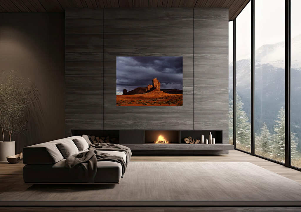 Storm clouds gather above Monument Valley, casting bold shadows across the land. The towering buttes glow with deep, rusty reds, offering a sense of strength and calm beneath the brewing sky. On canvas, this image feels grounded and textured — a natural centerpiece full of presence.