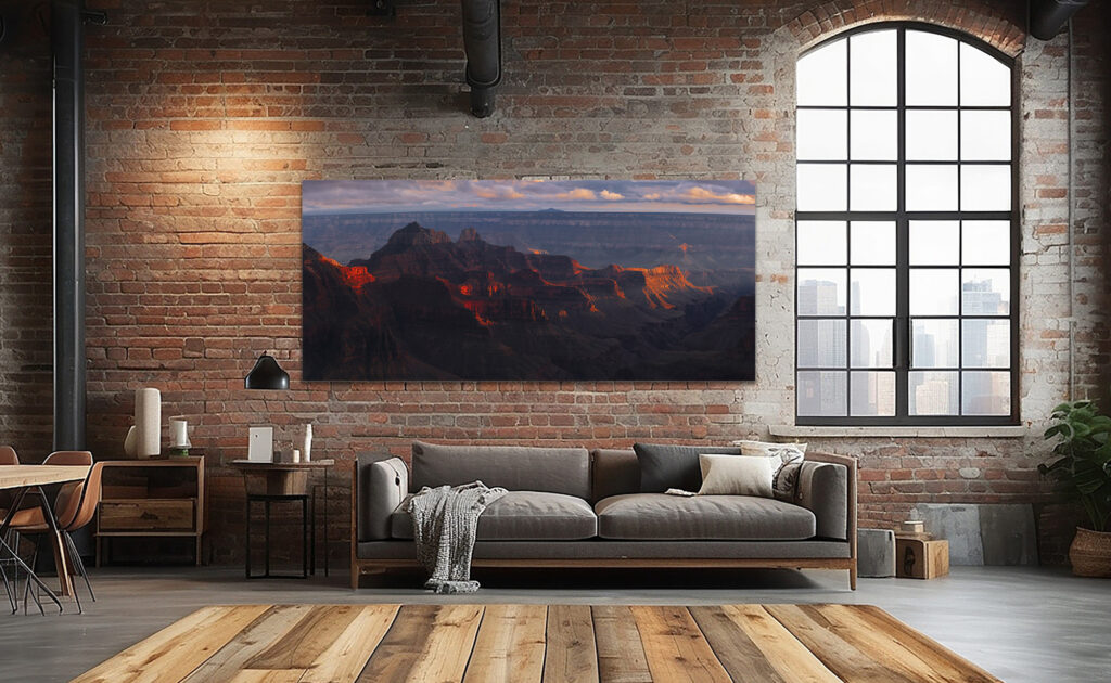 Shot from the North Rim, this rare perspective combines layered shadow and volcanic light, making it ideal for large-format canvas or metal prints where depth, texture, and warmth come to life. A perfect statement for interiors seeking both drama and stillness